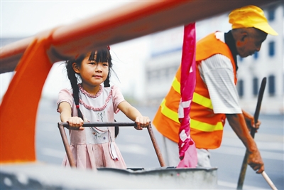 6岁的戴海燕在暑假期间帮助年迈的戴城民清扫大街(8月17日摄)。