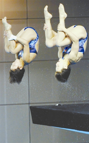 8月19日,深圳大运会跳水项目女子双人10米台决赛中,北京奥运会和罗马世锦赛双料冠军组合陈若琳/王鑫以349.98分获得冠军。本报记者 许之丰 摄