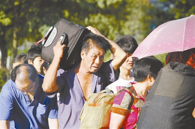 8月19日,重庆火车北站广场,旅客在烈日下排队进站。