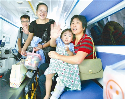 8月22日早晨6时30分,“7·23”温州动车事故中最后一位幸存者小伊伊,在奶奶等亲人的陪护下从温州坐救护车赴上海继续她的伤腿治疗。“7·23”事故最后幸存者小伊伊,经过温州医护人员近一个月的精心救治,伤情已明显好转。为让小伊伊取得最佳治疗效果,经卫生部联系,确定赴上海做进一步治疗。赵用 摄