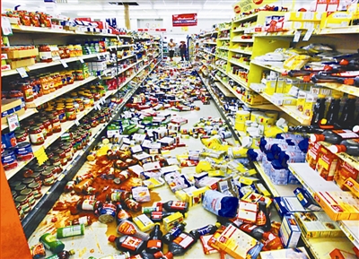格林尼治时间23日17时51分,美国弗吉尼亚州发生里氏5.9级地震,震源深度1公里,华盛顿和纽约均有明显震感。图为在弗吉尼亚州米纳勒尔,一间超市的货物散落满地。吉平 供图