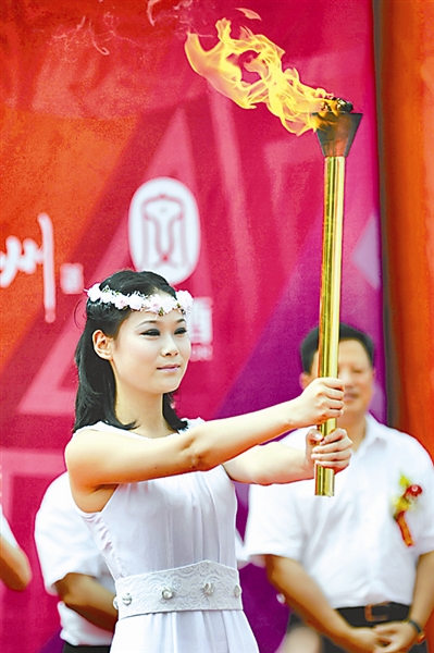 8月24日,第九届全国少数民族传统体育运动会采集圣火的圣女正在展示采集的火种。 新华社记者 刘续 摄