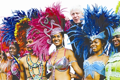 8月24日,伦敦市长鲍里斯·约翰逊在伦敦和参加诺丁山嘉年华的演员们一起合影。本次嘉年华将于8月28日开始,至8月29日结束。