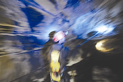 这是正在建设中的果洛龙洼矿区机采金矿的隧道之一。8月7日下午5点多钟,一阵爆破之后,一位职工冒着刺鼻的硝烟清理悬石。