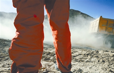 繁忙的果洛龙洼4050露天矿区,车辆来回穿梭的路上,尘土平均厚达5厘米以上。每当车辆过后烟尘就腾空而起。
