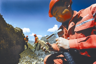 8月7日,勘探工程师祁昌林手拿一块刚刚从果洛龙洼4050露天平台矿区挖出的金矿认真端详。他介绍,手中这块金矿的黄金含量大约有20~30克/吨。