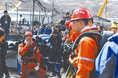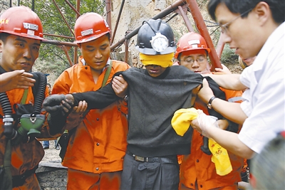 井下的幸存者在惊恐万状的等待中,第一个见到的是救护队员;