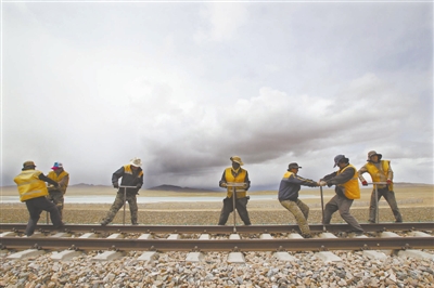 8月27日下午,在青藏铁路青海通天河段,铁路维护服务公司的工人正在检修铁路。该维修班组有14名职工,主要负责60公里铁路的维护,他们工作地点的平均海拔在4600米以上,空气稀薄、寒冷风大,但为了保障雪域天路的正常通行,他们恪尽职守、风餐露宿、舍“小家”顾“大家”,谱写了一曲动人的高原赞歌。 本报记者 杨登峰 摄