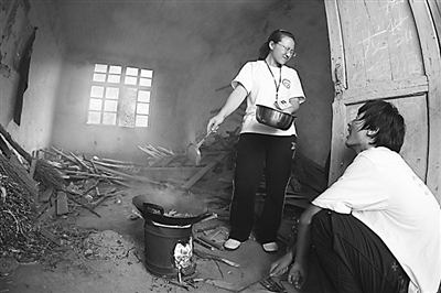 志愿者张莉第一次用简易锅灶劈柴火做饭,浓烟熏得她睁不开眼。