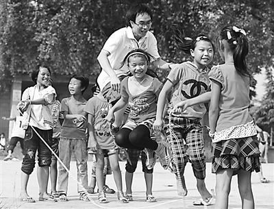 体育课上跟孩子们一起跳绳的志愿者胡边在吉卫镇葫芦小学。