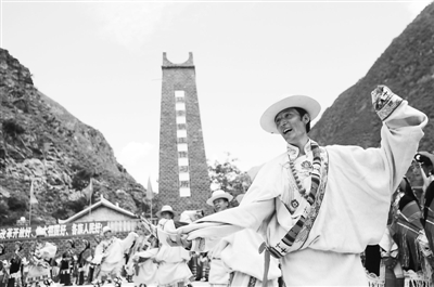 8月27日,四川阿坝藏族羌族自治州金川县马奈乡,身着盛装的嘉绒藏族演员在为参观者表演锅庄舞。