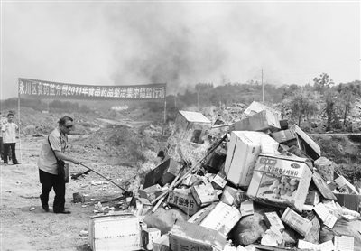 日前,重庆市永川食品药品监督管理分局在辖区某建筑工地对在“2011年食品药品整治集中销毁行动”查处的价值20多万元的假劣药品和食品,进行了集中焚烧行动。图为执法人员在焚烧现场的情形。本报特约通讯员 陈仕川 摄