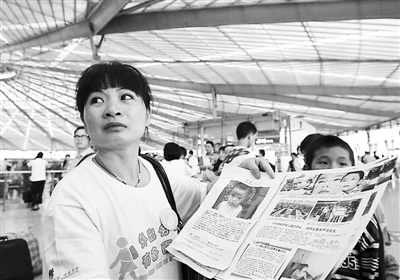 8月25日,防拐志愿者万光碧(左)在上海南站候车大厅内参与防拐宣传。她的儿子于4年前在江西老家被拐,至今未找到。