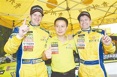 2011“金士百”杯四平·中国汽车拉力锦标赛于8月28日结束,贵州百灵车队的英国车手马克·希金斯/托马斯以总用时1小时25分52秒的成绩帮助车队获得了本赛季首个全场冠军。图为获胜后车手和车队领导合影。(周萌)