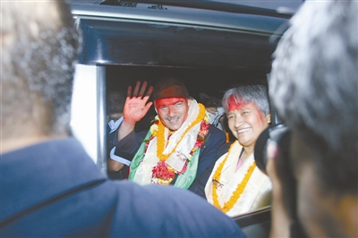 8月28日,在尼泊尔首都加德满都,尼泊尔联合共产党(毛主义)副主席巴布拉姆·巴特拉伊当选新一任尼泊尔总理后向媒体挥手致意。