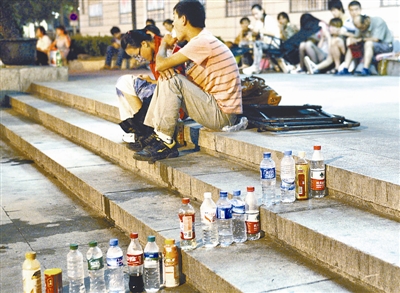 8月29日深夜,排队挂号的患者在北京协和医院门口用饮料瓶为标记排号。