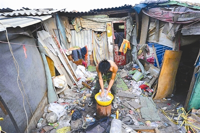 8月27日,一拾荒人在自己所住的窝棚前用水清洗身体。
