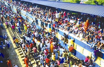 8月30日在孟加拉国达卡,穆斯林教徒挤上一列开往家乡的火车。他们都急切地赶回家与家人共度开斋节。谢涛 供图