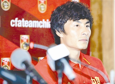 9月1日,中国国家男子足球队在昆明召开了巴西世界杯预选赛亚洲区20强首场比赛的新闻发布会,队长李玮锋出席。9月2日,他们迎战新加坡队。20强小组赛出线,才能进入十强赛。 新华社记者 秦晴 摄