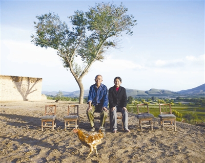 陕西省靖边县席麻湾乡,61岁的王贵贤(左)和老伴张树美在家门前(8月24日摄)。王贵贤有4个孩子离开村子外出打工。新华社记者 刘杰摄