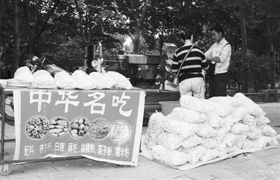在武汉市东西湖区,一些小商贩在公路边用柴油机械生产膨化“三无”食品,还打着“中华名吃”的招牌。市相关部门对这类小商贩不断清理,但因为总有人消费,清理工作效果不大。有关部门提醒,如此“中华名吃”吃不得,为了自己的健康,还是要到正规合法的商铺去购买。眉扬 摄