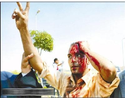 9月5日,在埃及开罗警察学院外,一名抗议者在冲突中受伤。当日,埃及前总统穆巴拉克在开罗警察学院接受第三次庭审。新华社记者 李木子 摄