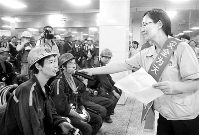 9月1日,宣讲团成员正在井口开展安全知识问答。在淮北矿业孙疃煤矿活跃着一个由十余名退休矿嫂自发组成的编外“安全宣讲团”,她们自编自排安全文艺节目,深入到各单位班前会、井口候罐室宣传安全知识,利用亲情感化的独到优势,触动一线职工心中的感情弦,用爱心撑起安全生产“保护伞”。王亮 摄