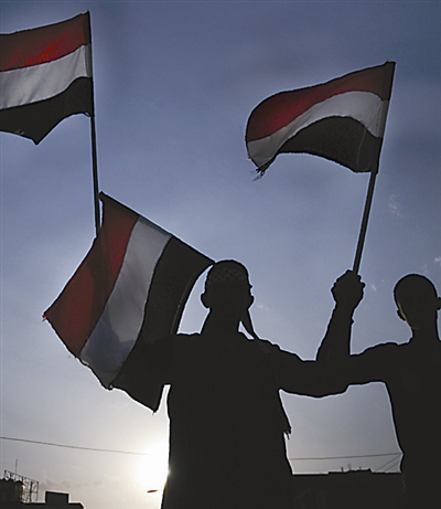 9月6日,两名反政府示威者在也门首都萨那参加示威游行。