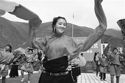 玉树灾后重建首座州级高中——玉树州民族中学日前正式交付使用,学生们跳起欢快的锅庄舞,迎接新校园竣工 刘文 摄
