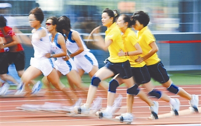 9月11日,第九届全国少数民族传统体育运动会比赛首日,板鞋竞速的60米快速比赛正在进行。板鞋竞速比赛是由多名运动员一起将足套在同一双板鞋上,在田径场上进行的比赛,以在同等的距离内所用时间多少决定成绩名次。