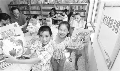 辽宁省义县总工会关注农村留守儿童,在新学期到来之前,把4800余册儿童读物送到10余所农村小学,并协助5所小学办起留守儿童图书馆、阅览室。图为义县总工会与图书馆无偿协助西关小学办起图书馆留守儿童获新书。李铁成 摄