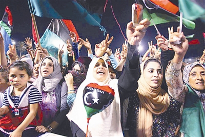 9月12日,利比亚首都的黎波里举行集会,庆祝全国过渡委员会迁至当地。图为的黎波里市的民众在集会上欢呼雀跃,庆祝胜利。谢涛 供图