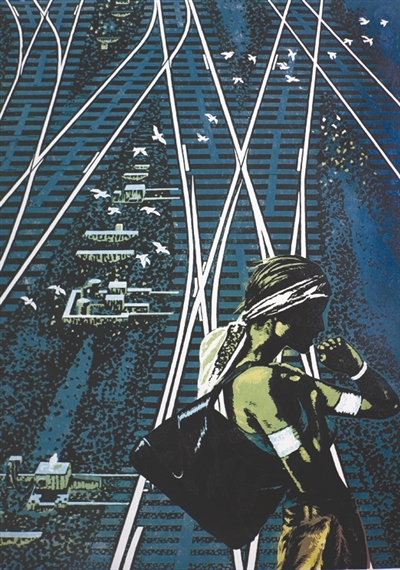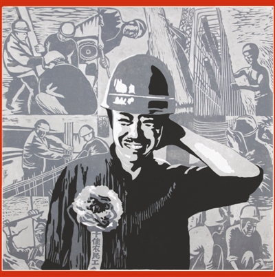 美术作品是靠构图和造型造型立意,养眼才能有美感。题材无论大小,重要的是能感染观者,无病呻吟及自我邀赏不是真艺术,透过形象表现本质和充满真诚才是艺术美感的真谛。主题直白的《二喜的光荣》,就是这样及美感和真诚的版画作品;憨笑但充满阳光的形象及火热的劳动背景将创意和感悟表述的清晰明了,“十佳农民工”胸花点缀得恰到好处,不是亲历者很难发掘出这样的笑容和场景;现实主义的表现手法是艺术创作最直接地感动,创作者被感动才能感动渎者。《不差钱》以最时髦的调侃语为题,却用艺术形象阐述一个大主题,“对劳动者的付出要保证‘不差钱’”,作品表现的是劳动者得偿所愿的喜悦,也透视对为政者的信任。《腾空》俯视的构图寓为“腾”,空白的背景寓为“空”;又是一幅劳动者的自画像,感觉和体验,真实和浪漫尽在创意加写意中充分表现在同一构图中。《时间与空间》这是一位老艺术家创作的新时空题材版画,人物造型充满时尚元素,而延展的铁路背景喻示着时尚在不同空间和时间流动中有着不同定义。《夏光》、《窗》等作品都是透过建设者的眼光看到的艺术流彩,他们用不同的视角撷取了美的瞬间,放大为充满活力的光彩。