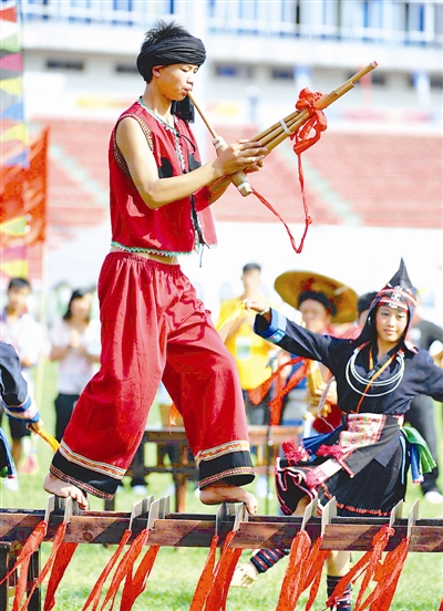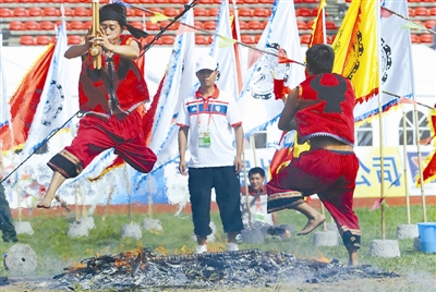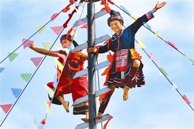 上刀山之前的祭祀后,苗族青年男女赤脚向刀山走去。刀山高10余米,“梯子”是一把把锋利的钢刀,或是一个“刀床”(左上图)。刀口朝上,要爬上刀山,表演者必须赤脚踩在刀口上。左下图为跳火海。