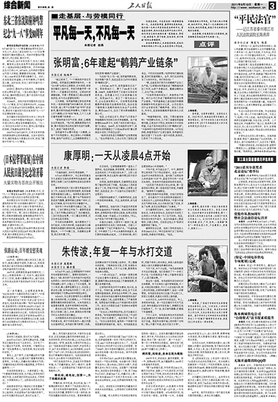 记者走进的,不过是这些一线劳模普通的一天。无论是张明富、康厚明还是朱传波,他们每一天的工作其实就是这样的平凡、普通甚至琐碎。然而正是在这样平凡的工作中,他们用自己的行动践行着 “爱岗敬业、争创一流、艰苦奋斗、勇于创新、淡泊名利、甘于奉献”的伟大劳模精神。