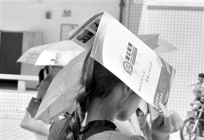 9月17日,福州,在福建农林大学考点,气温偏高,走出考场的考生用宣传单来遮阳。当日,福建省福州市,福建秋季公务员考试开始笔试,全省8万名考生参加,近2600个岗位均有考生报名。据了解,2011年福建 省春季共计划录用公务员为2420名,相比去年福建省春季计划录用的4571名而言,减少了近五成。