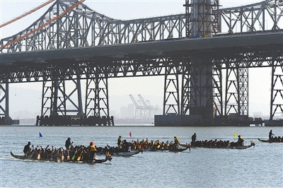9月17日,在美国旧金山举办的国际龙舟节上,参赛健儿奋力角逐。当日,为期两天的旧金山国际龙舟节开幕,共有120多支龙舟队参赛。 新华社发
