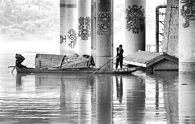 9月19日,重庆,一艘渔船划过被江水淹没的瓦房。