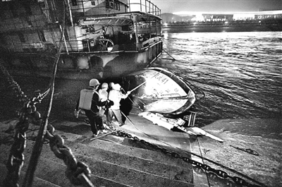 9月19日晚,武汉汉江江滩大门附近,一艘“鄂运政41”巡逻艇被江水冲出100多米后侧翻江中,卡在一艘趸船下。救援人员正在抢险。