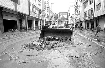 9月19日,四川省巴中市平昌县白衣镇,洪水退去,挖掘机在街道清淤。白衣镇是这次平昌160年一遇的洪水受灾最为严重的地方。