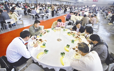 9月20日,南京,参加中国城市规划年会的3000多名代表在会议结束后集体吃盒饭。在这里,无论是与会嘉宾还是各地规划局的代表,都是凭饭票排队领饭,盒饭是两荤两素的标准:三只白灼虾、千张结烧肉、土豆丝和清炒花菜。宋峤 摄