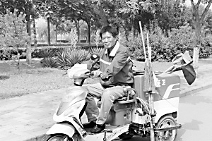 梁炳申骑上电动车,车上挂着对讲机,车身上绑着笤帚和自制的垃圾抄网。他说,保洁工作每天早晨5点开始,遇到雨雪天气,还会更早些。