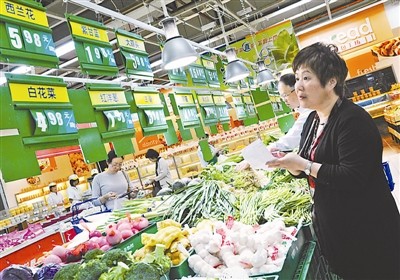 随着购物人流,一位身材微胖的中年妇女手捏纸笔,在超市最热闹的蔬菜肉类区域停下了脚步。只见她一边仔细查看悬挂着的蔬菜价牌,核对着包装好蔬菜的条形码标签及价格,一边询问这询问那,还不停地在纸上记录着。