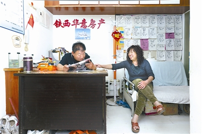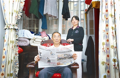 上海:王双美和丈夫在新的经济适用房里(8月3日摄)。2010年王双美搬入上海松江泗泾新凯家园经济适用房。她的家原居住在枫林街道宛南四村,是一间15.6平方米的房间(下图)。