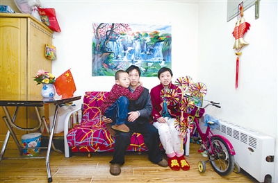 北京:李贵元(中)与妻儿居住在北京丰台区晓月苑一所廉租房里。20多年前,河北农民李贵元两手空空来北京闯荡。居无定所,四处投靠老乡。结婚后是他的老丈人花200元在自己家房檐边为小两口加盖了一个20平方米的“偏房”(下图)。