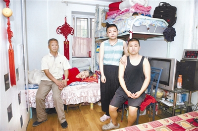 天津:63岁的退休工人孔庆忠(左一)和老伴、两个儿子住在天津金堂家园的廉租房里,38平方米的房子,每月租金42元。