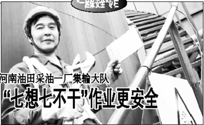 “想安全禁令,不安全不干;想安全风险,不清楚不干;想安全措施,不完善不干;想安全技能,不具备不干;想安全环境,不安全不干;想安全用品,不配齐不干;想安全确认,不落实不干”。河南油田采油一厂集输大队用这“七想七不干”将“本质安全”落到实处,让作业环节更安全。