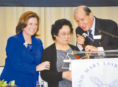 图为中国中医科学院终身研究员屠呦呦(中)在美国纽约举行的拉斯克奖颁奖仪式上领奖。新华社记者 任海军 摄
