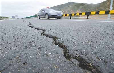 投资87亿多元建设的甘肃省天水至定西段高速公路,是连接我国东、中、西部的骨干道路——连霍(连云港至霍尔果斯)高速公路的重要组成部分,但通车约半年竟出现坑槽、裂缝、沉降等重大病害,部分路段不得不铲除重铺。 新华社记者 张锰 摄