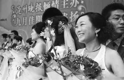 9月25日,河北省沧州市18对新人参加由当地一媒体主办的“第五届集体婚礼”,每对新人的婚礼费用仅为1200元。据悉,从2007年开始,该媒体每年举办一场集体婚礼,每对新人的婚礼费用仅为千元左右,受到了追求时尚和节俭的年轻恋人的追捧。傅新春 摄